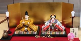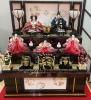 金糸の多い豪華な金襴の衣裳を着せ付けた親王に綺麗なワインカラーの屏風と台を組み合わせしました。台の中にお人形含め全てが仕舞えるセットです。